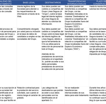 En la presente política de privacidad encontrará una tabla identificando, por cada uno de los diferentes tratamientos de datos realizados por la Sociedad, la siguiente información: